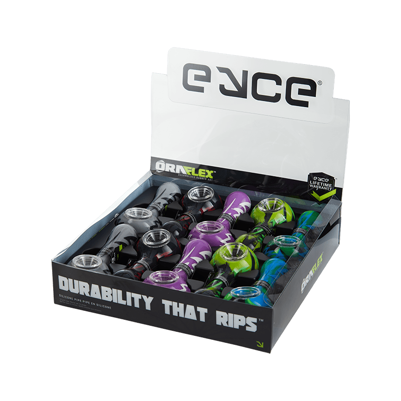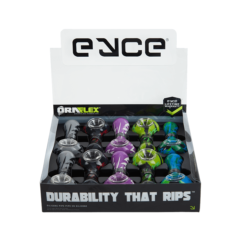 Introducing Eyce's ORAFLEX Switchback Spoon - the first in their innovative series. This pipe features two layers of platinum-cured silicone, with a clear outer layer for a sleek and glossy look, custom-made and patented by Eyce. The switchback design comes in a variety of electrifying base colors with eye-catching hand painted detailing.